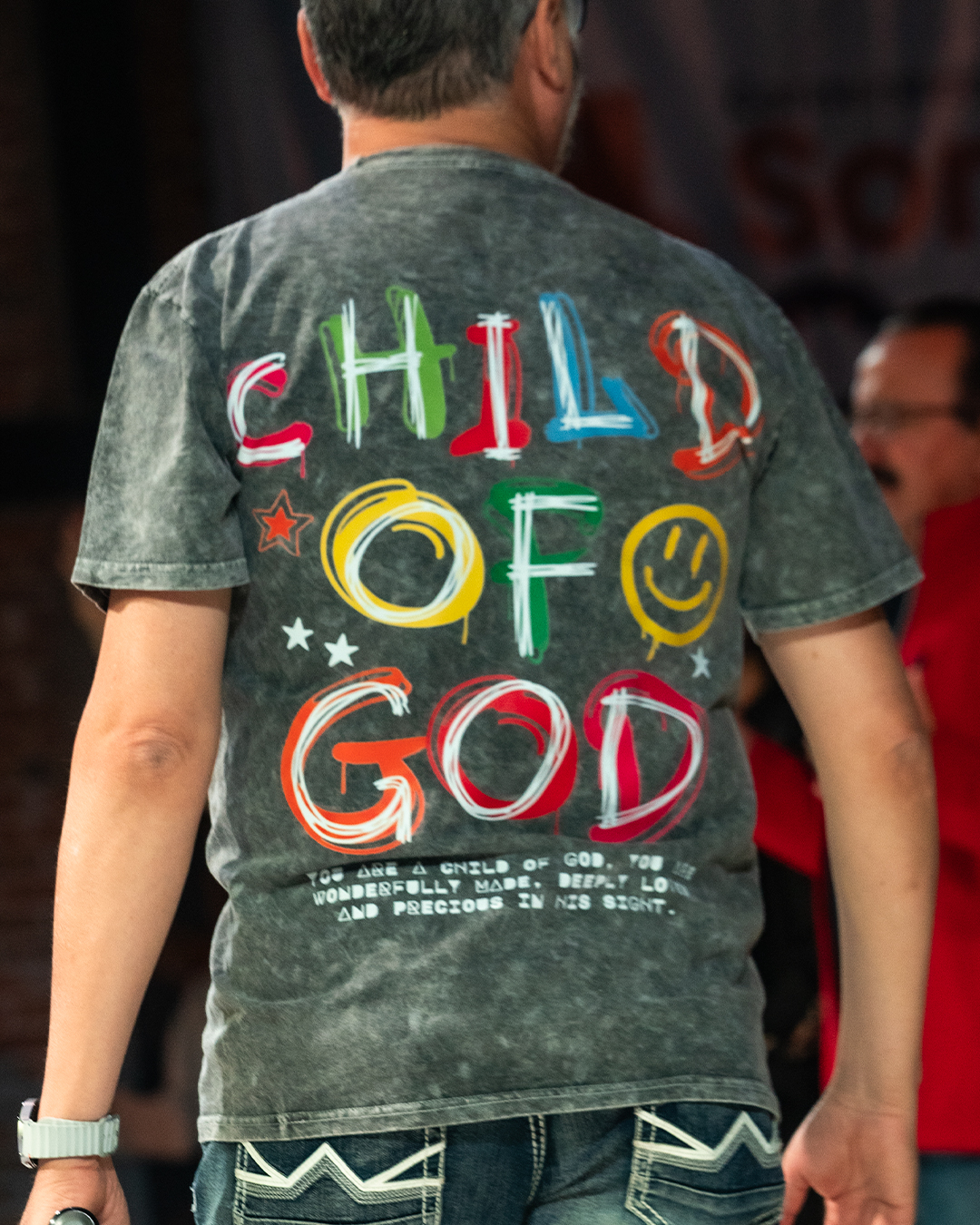 Playera con diseño a dos vistas. Al frente, icono de Cornerstone Latam; atrás, frase “CHILD OF GOD” en colores.